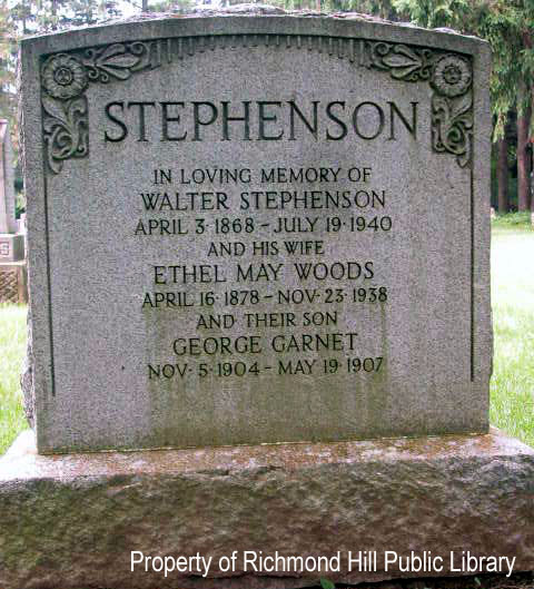 StephensonEast face![]() Stephenson In loving memory of Walter Stephenson April 3. 1868 - July 19. 1940 and his wife Ethel May Woods April 16. 1878 - Nov. 23. 1938 and their son George Garnet Nov. 5. 1904 - May 19. 1907 |